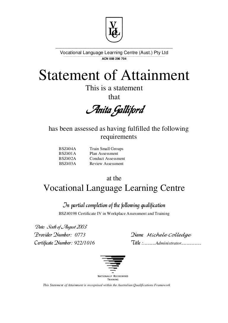 Anita Galliford Statement Of Attainment Training And Assessment U
